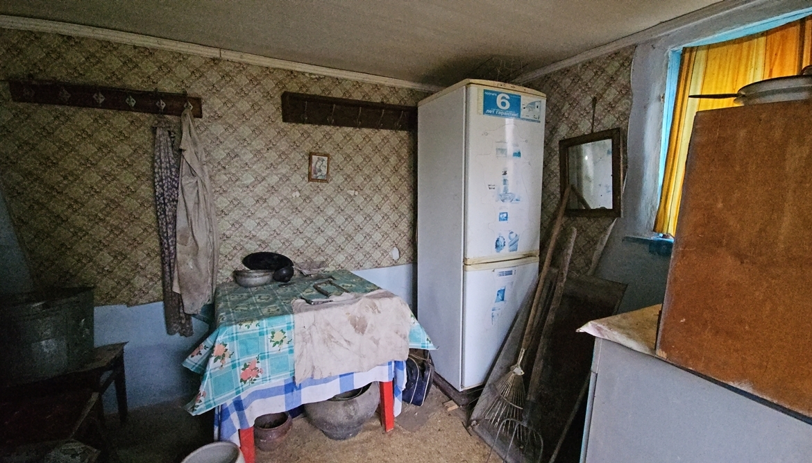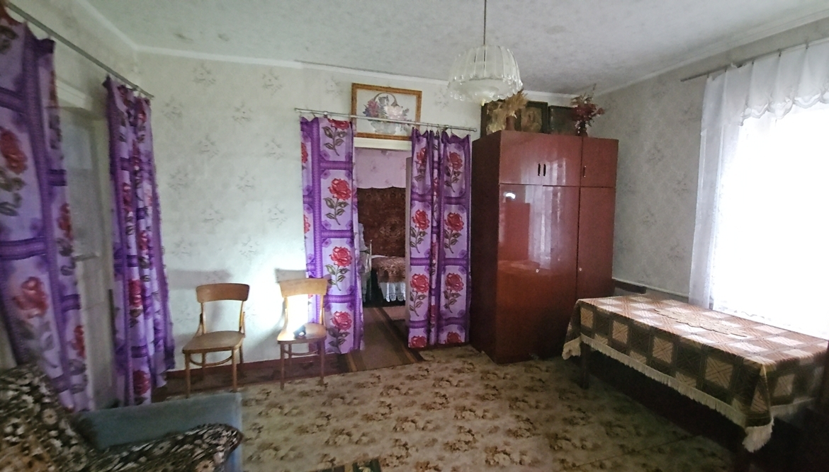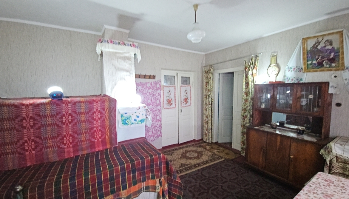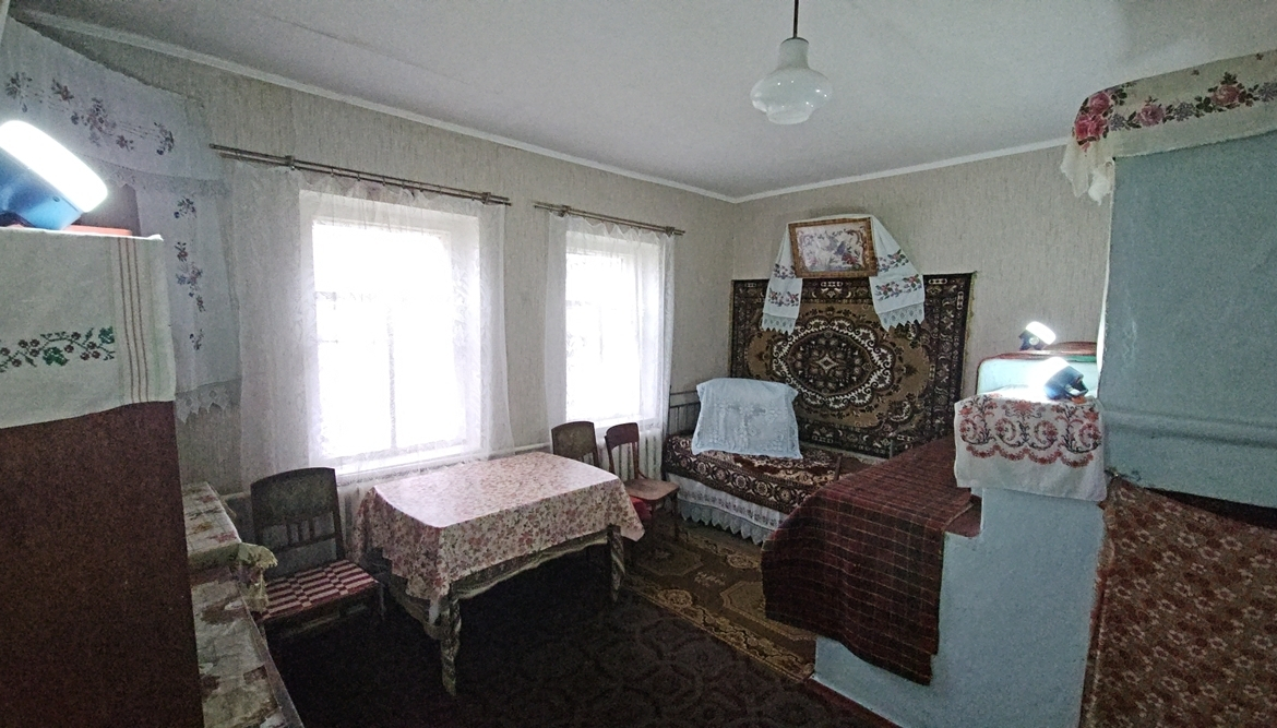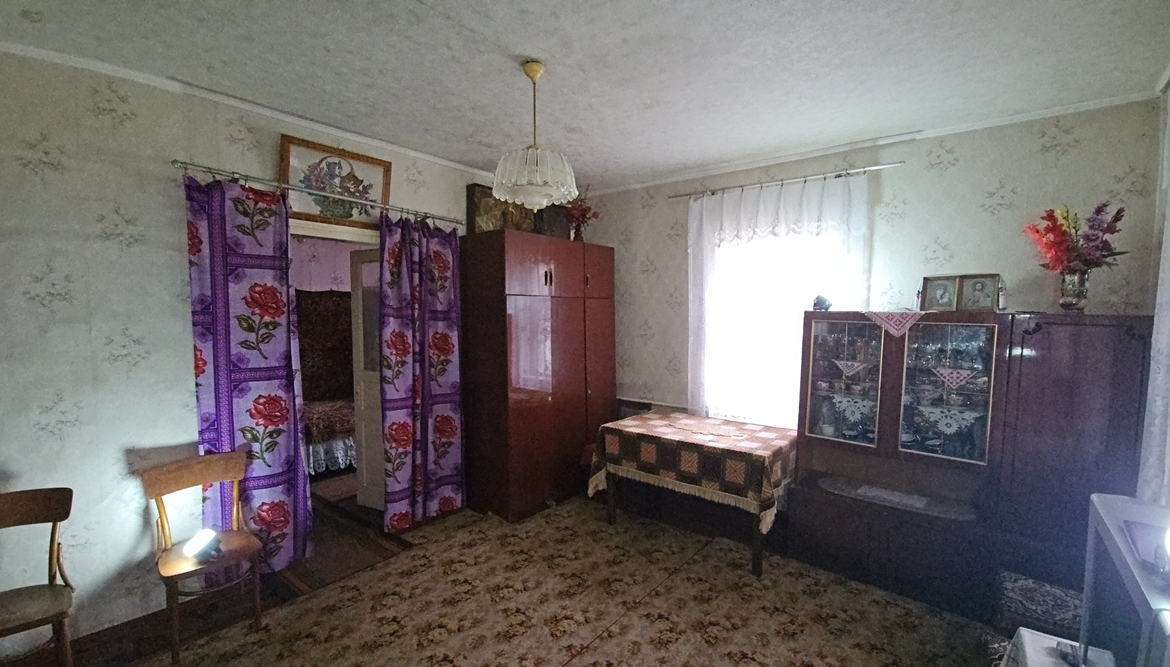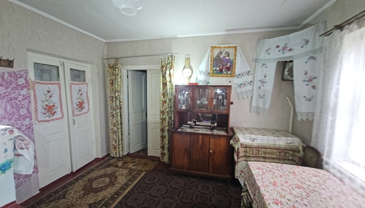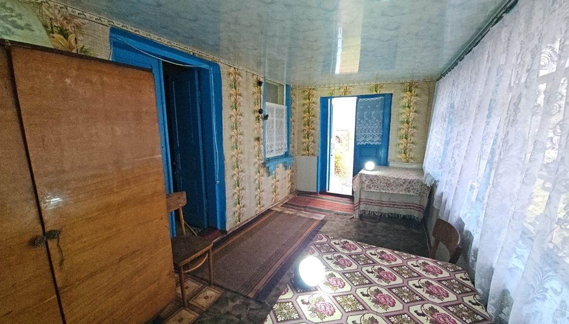 В будинку розташовані: прибудована (у 1996 р.) холодна веранда, сіни з виходом на горище, кухня (газова плита, парапетний газовий котел, холодильник), кімната з діючою піччю та грубою, прохідна зала та ще одна кімната зі скринею. Підлога – дерево, стіни – шпалери.