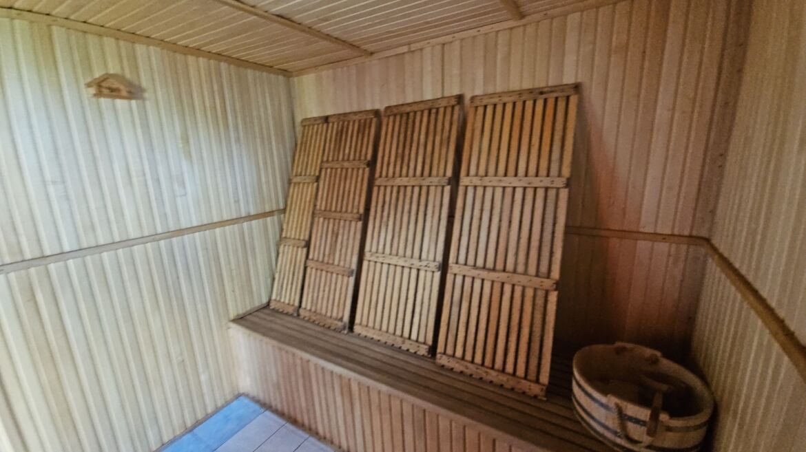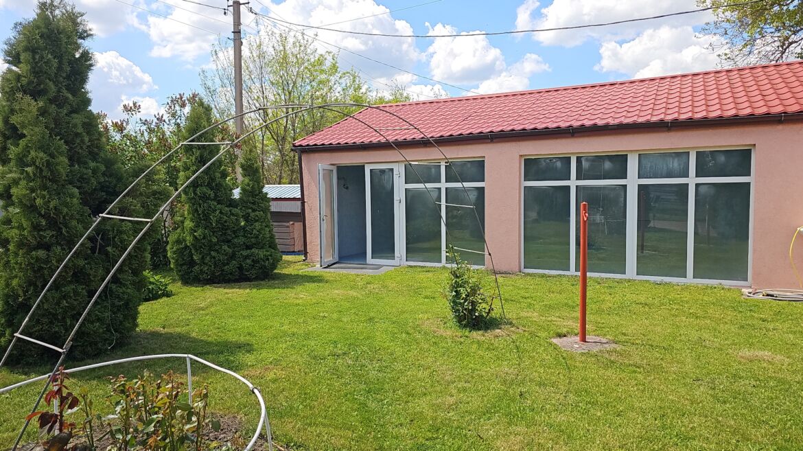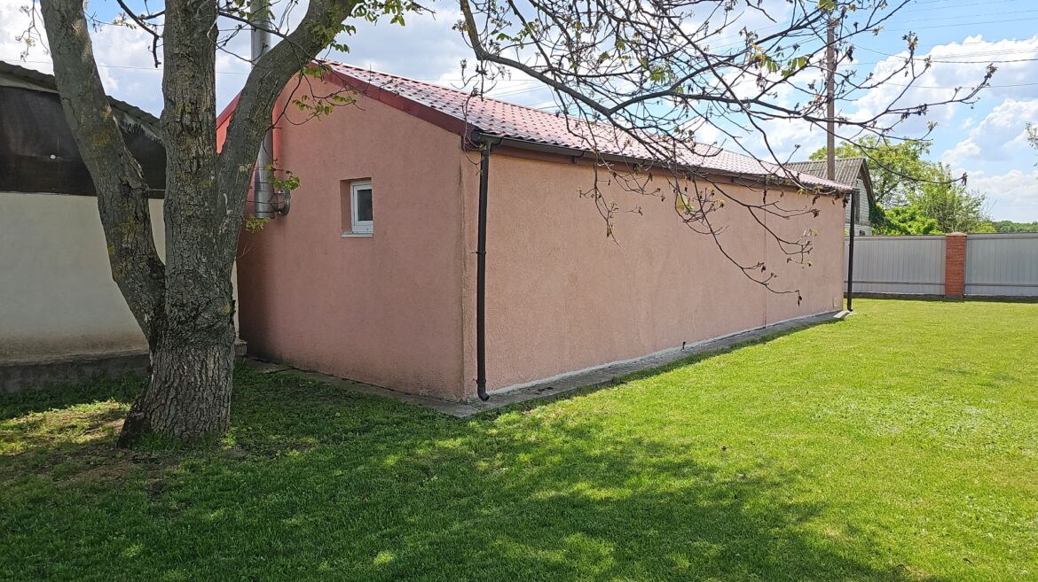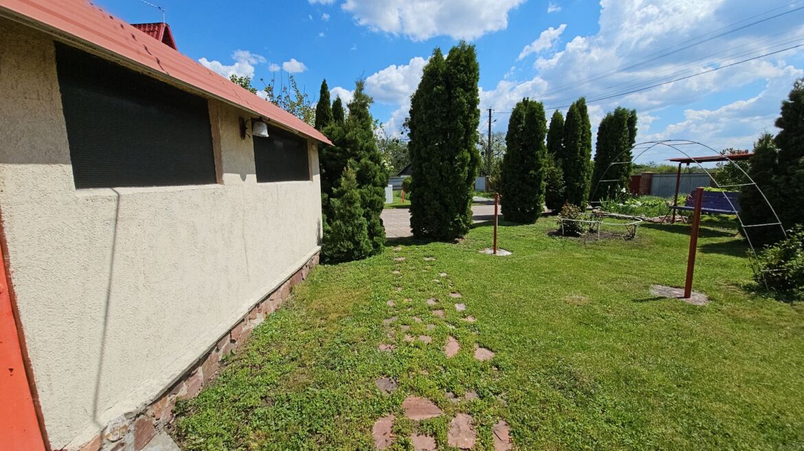 На цій ділянці є гараж, басейн з сауною, альтанка з мангалом.Всі споруди мають заземлення та відливи. Огорожа ділянки – бетонний фундамент з цегляними опорами, між якими встановлені металопрофільні листи, ширина воріт 4 м. Біля будинку є вуличне освітлення. Гараж висотою 3 метра та глибиною 10 м, побудований з газоблоку, стеля – металокаркас, гідробар’єр , металопрофіль, підлога – натуральний камінь, стіни обкладені дерев’яною вагонкою. З гаража спускаємось у невеличке підвальне приміщення (має вентиляцію), яке слугує погребом. Сауна з басейном. Басейн має 1,5 метрову глибину та 28 кубів, чудову систему очищення.Сауна з двома виходами. Один – до басейну, другий – до кімнати відпочинку, а з неї на подвір’я. Котел чавунний на дровах з системою підігріву води. Стіни обкладені деревом. Підлога – стяжка, пінопласт, плитка. Від сауни до будинку стежка викладена з натурального каменю. Дерев’яна альтанка з москітними сітками, дах – металочерепиця, мангал з червоної цегли, трішечки схожий на піч. Біля стіни є місце з дровами. Поруч знаходиться баскетбольний майданчик, гойдалка та невеличкий водоспад. На території є літній душ та туалет(газоблок).