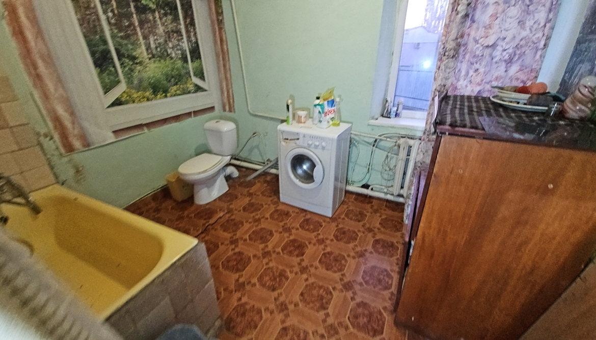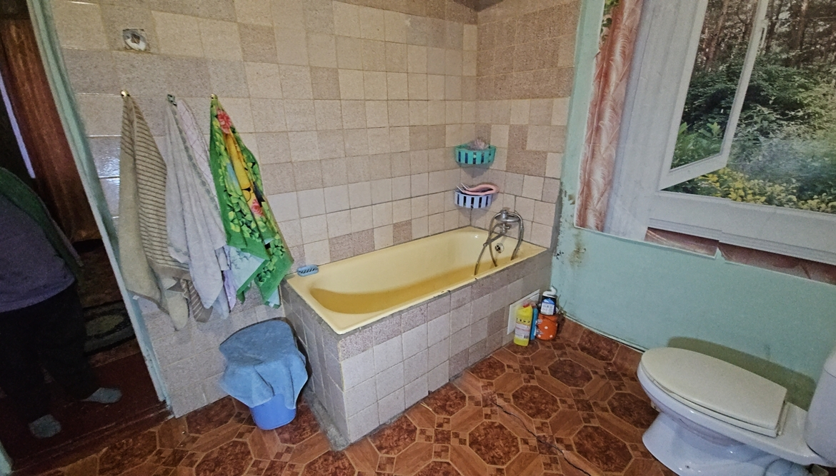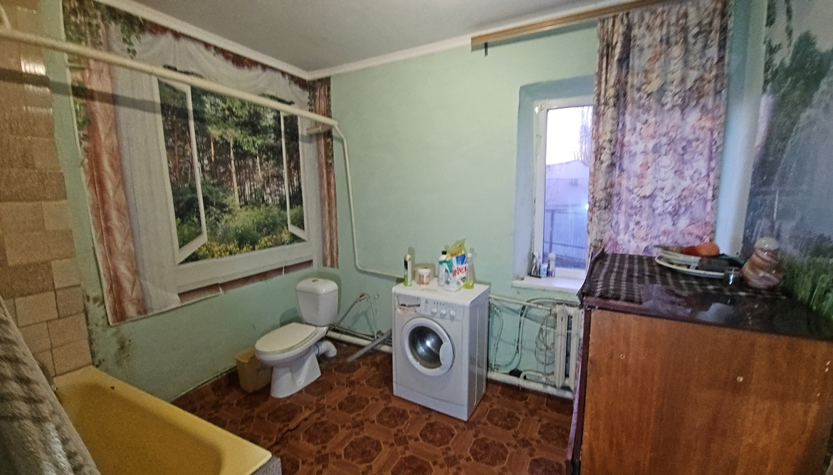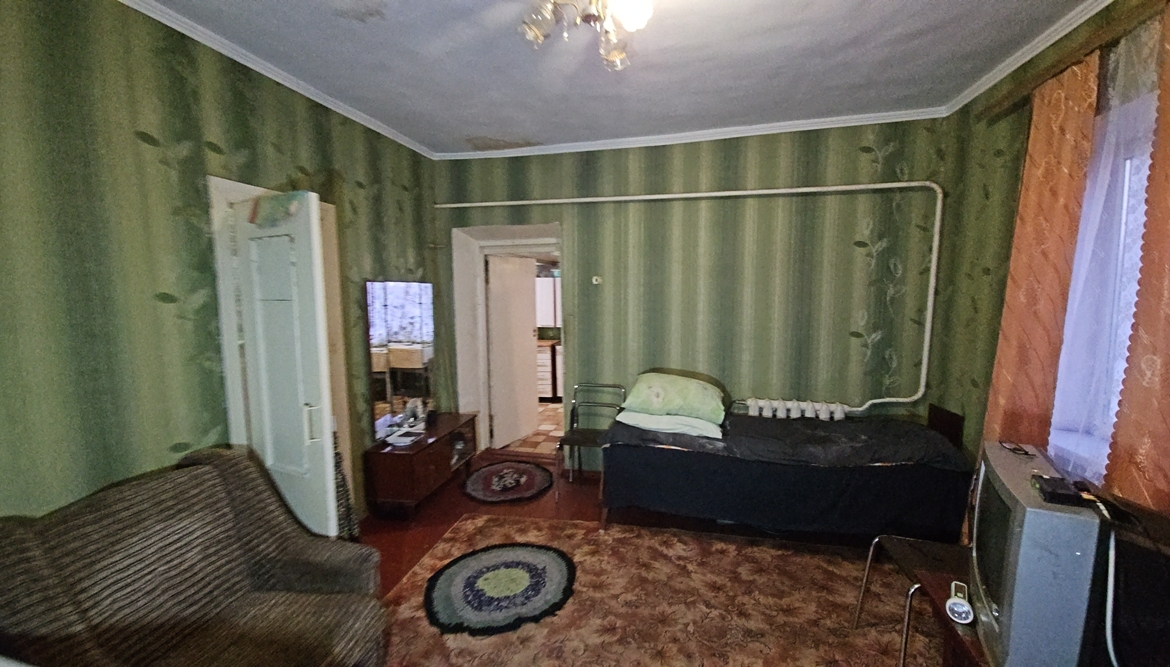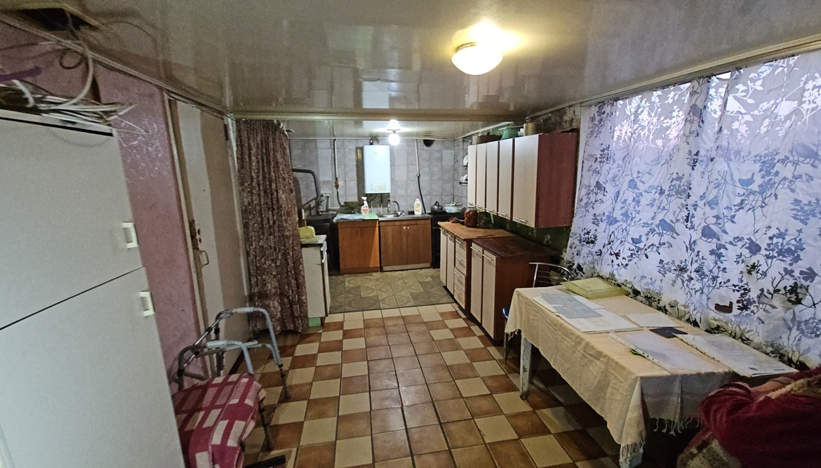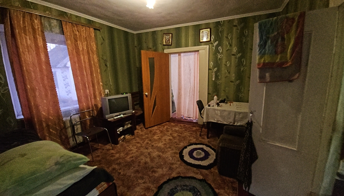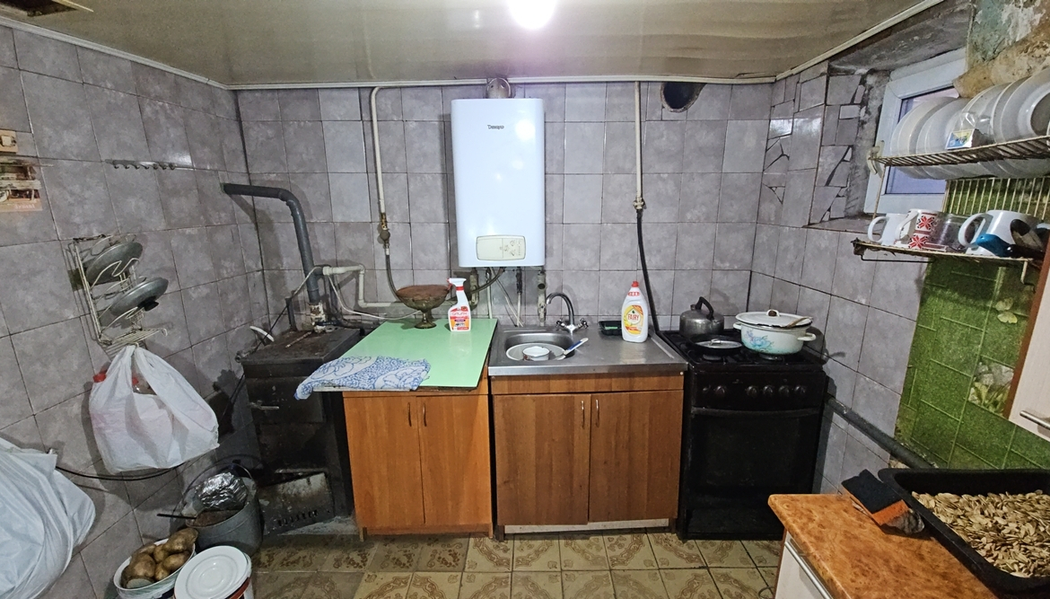 В будинку розташовані: прибудована холодна веранда, кухня (підлога – плитка, котли – газовий двоконтурний та твердопаливний, газова плита, холодильник, мийка), комора для дров, вітальня, санвузол ( унітаз, ванна, пральна машина), дві кімнати (одна прохідна).