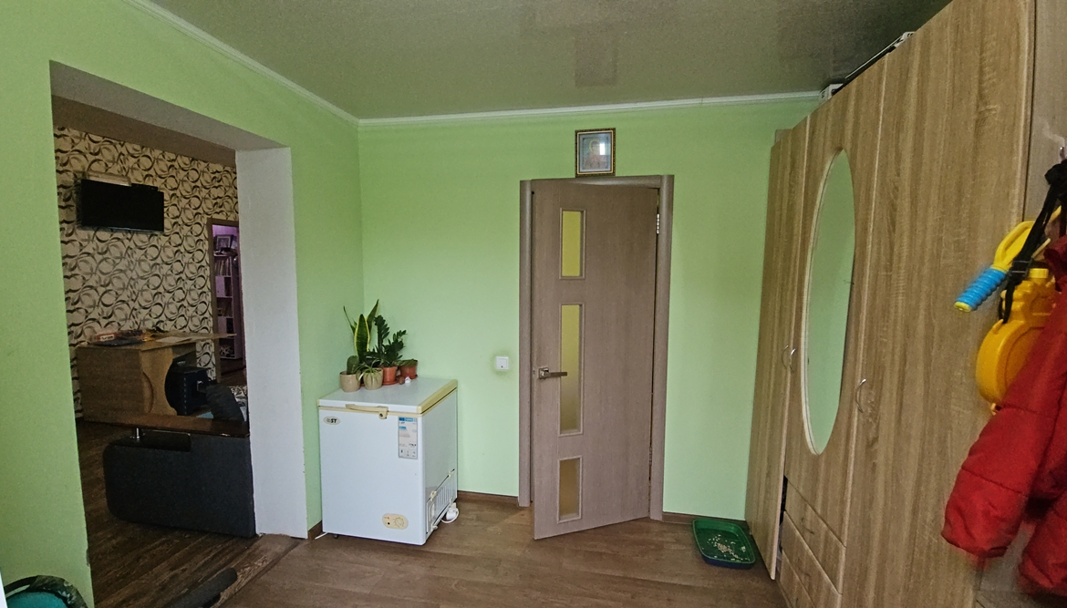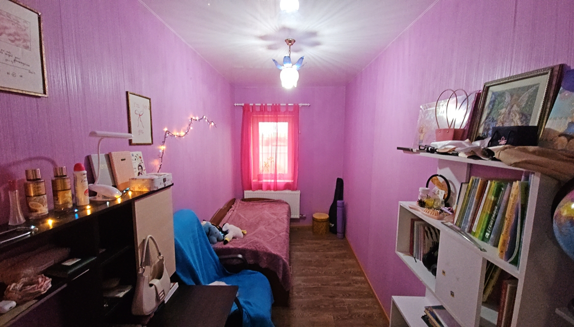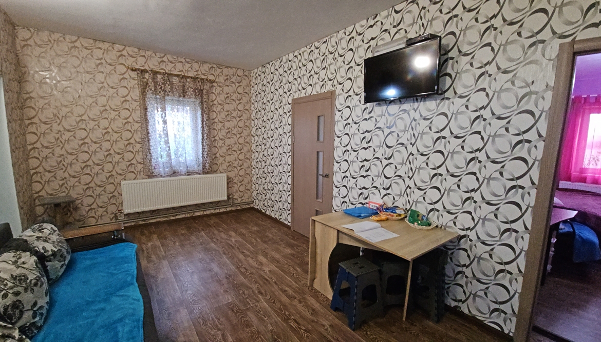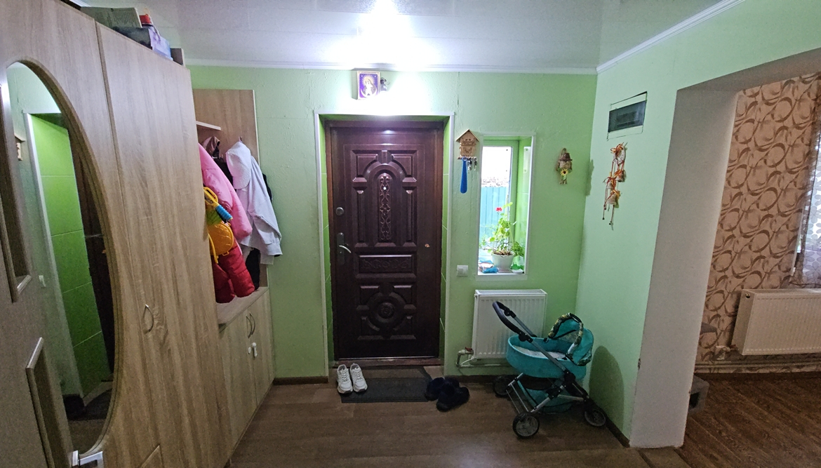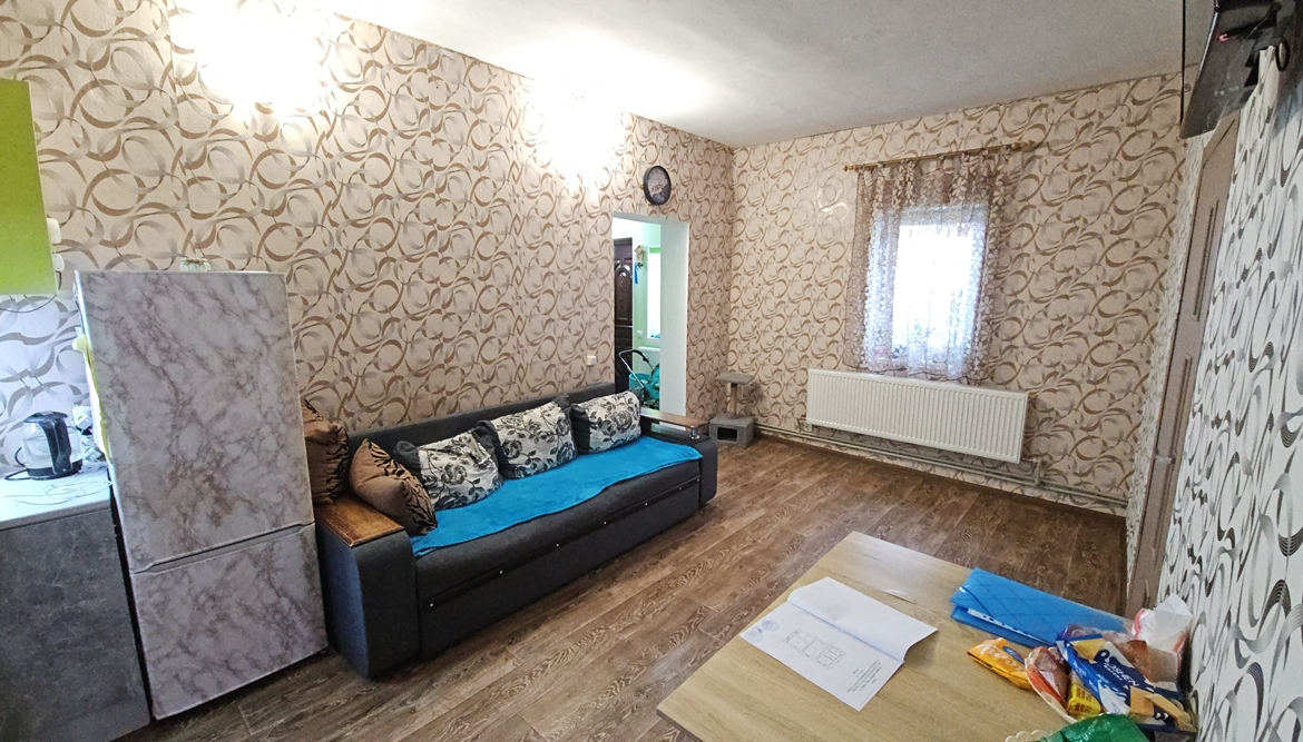 В будинку розташовані: вітальня (морозильна камера), санвузол (кутова ванна, унітаз, рукомийник), комірка- котельня (бойлер, парапетний газовий котел, пралка), кухня- студія (газова плита, витяжка, мийка, холодильник, телевізор), дві кімнати. Підлога – лінолеум, стеля – натяжна.