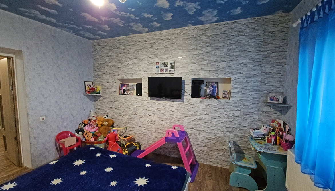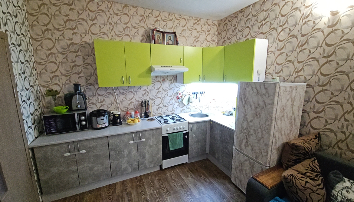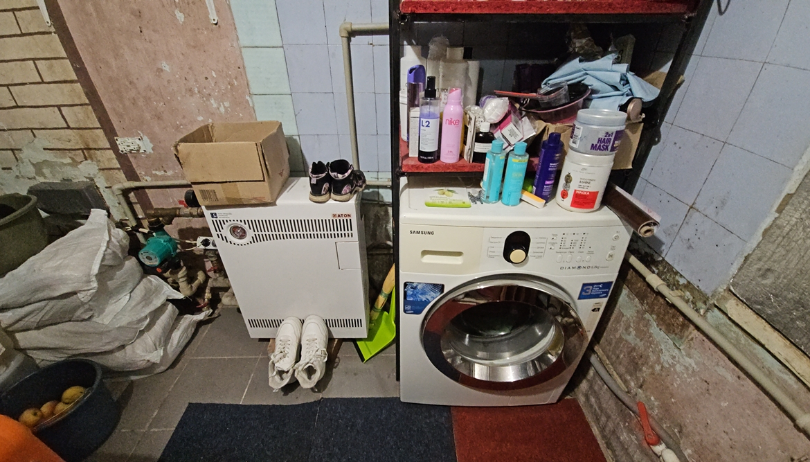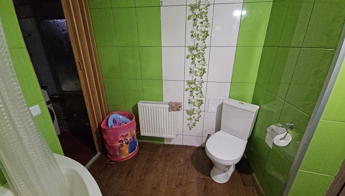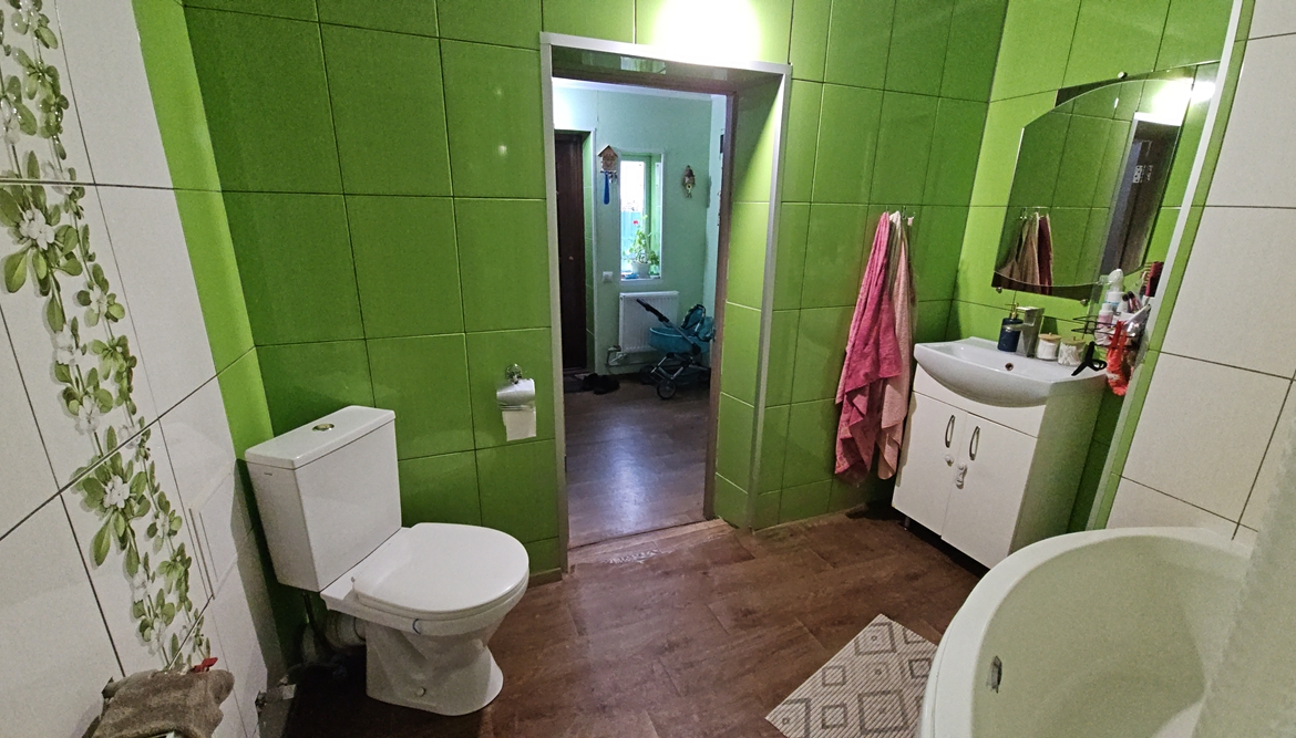В будинку розташовані: вітальня (морозильна камера), санвузол (кутова ванна, унітаз, рукомийник), комірка- котельня (бойлер, парапетний газовий котел, пралка), кухня- студія (газова плита, витяжка, мийка, холодильник, телевізор), дві кімнати. Підлога – лінолеум, стеля – натяжна.