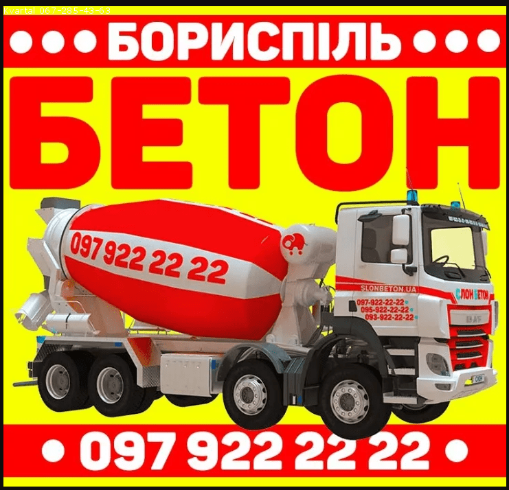 Ми пропонуємо Вам бетон В15 по Борисполю та Яготину і Бориспільському району, з самого прилеглого до вас бетонного вузла! Міксера доставляють в Бориспіль, Березань, Баришівка, Яготин, Переяслав-Хмельницький, Пирятин, Золотоноша, Іванків, Згурівка, Канів і в усі населені пункти поруч! Є міксера з трубою (додатковими лотками) до 6 метрів! Міксера різного об’єму: 4, 7, 9, 10, 12, 15м3!